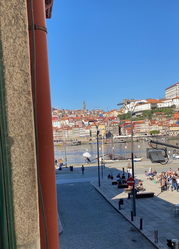 In Porto haben wir uns wieder ein kleines Airbnb-Appartement genommen. Es lag in Vila Nova de Gaia, gleich auf der anderen Flussseite mit Blick auf Porto. In Porto kann man sich – normalerweise – alles gut erlaufen. Aber dafür muss man zwei gesunde Füße haben. Wir dachten, eine kleine Wohnung direkt inmitten des Geschehens ist eine gute Idee, dann kann auch Chrischi am Leben in der Stadt teilhaben. Hier der Blick aus unserem Fenster.