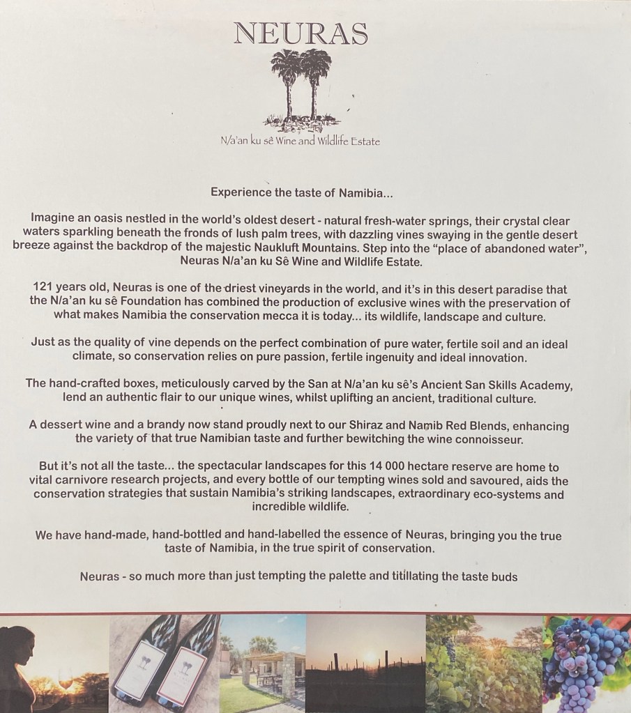 Unser Weg führte uns weiter durch die Wüste zur Neuras Winery. Mitten in der Wüste liegt eine Oase, in der tatsächlich Weinanbau gelingt. Wir haben dort einen entspannten Nachmittag am Pool verbracht und um 17 Uhr hatten wir eine Führung über das Areal und ein anschließendes Wine tasting. Die Anbauflächen sind sehr klein und es können nur wenige Tausend Flaschen Wein (u.a. Shiraz und Merlot) pro Jahr produziert werden. Die Qualität ist aber richtig gut und vor allem ist dieser Wein zu 100% handgemacht. Das war sehr beeindruckend. Emmanuel – der Mitarbeiter, der die Führung über das Areal gemacht hat – war sichtlich stolz auf seinen Wein. Wir waren die einzigen Gäste an diesem Abend. Um 19:30 gab es Abendessen – tatsächlich waren wir aber noch voll von den ganzen kleinen Happen, die es begleitend zur Weinverkostung gab.