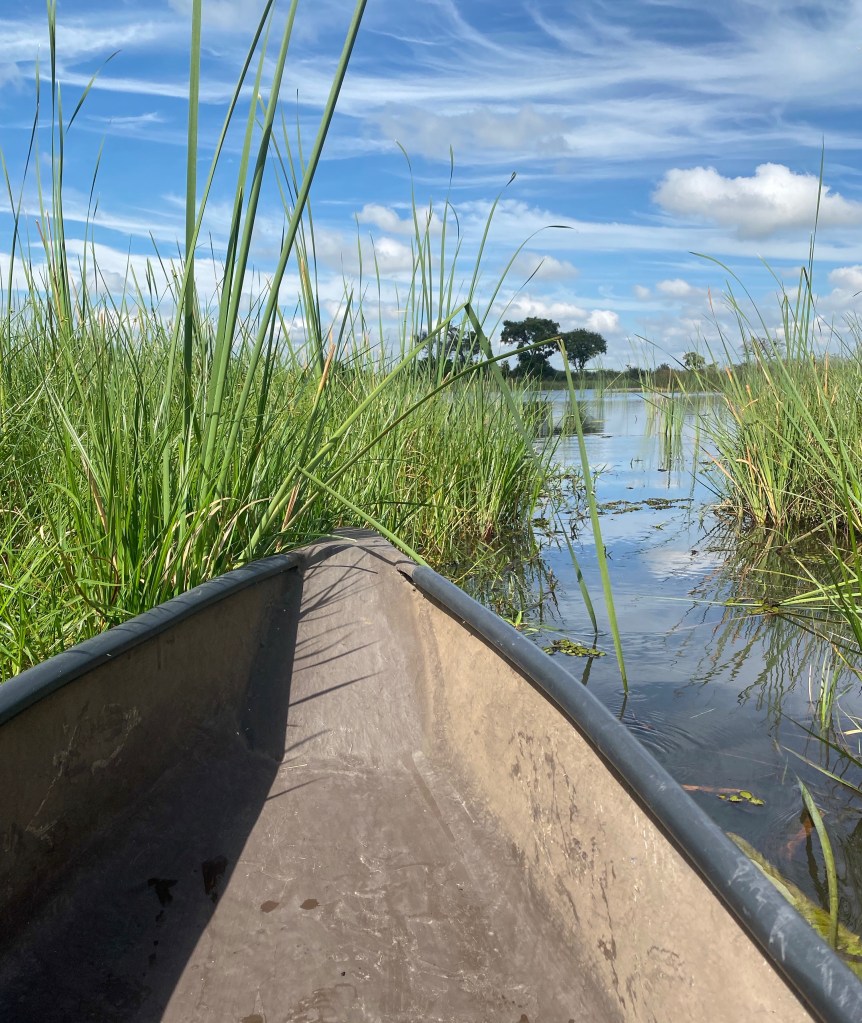Am nächsten Tag hatten wir eine komplett andere Tour ins Okavango Delta gebucht und zwar per Boot. Wir wurden um 7:30 Uhr abgeholt und ins Delta gefahren (ca. 1,5 Stunden). Dann ging es ins Boot. In Kasane hatte unser Guide diese Boote als „Banana boat“ bezeichnet. Unser Modell war aber nicht aus Holz sondern Kunststoff. Im Heck steht der „Poler“ der das Boot durch das Wasser stakt. Wir sind mit zwei Booten gefahren, eines für Chrischi und mich und eines für das „Material“ – es sollte später im Busch Mittagessen geben. Man bleibt bei diesen Touren immer im sehr flachen Gewässer. Dort ist es sicher vor Krokodilen und Flusspferden, die sich lieber im etwas tieferen Wasser tummeln. Schließlich sind wir auf einer Insel gelandet und dort ging es zu Fuß weiter zu einem Wasserloch. Wir sind einer kleinen Gruppe Giraffen und und einer großen Gruppe Gnus begegnet, Hippos und Krokodile gab es zum Glück nur aus der Ferne. Das war auch toll, mal durch den Busch zu laufen. Wir hatten somit in kurzer Zeit ganz unterschiedliche Perspektiven auf das Okavango Delta.