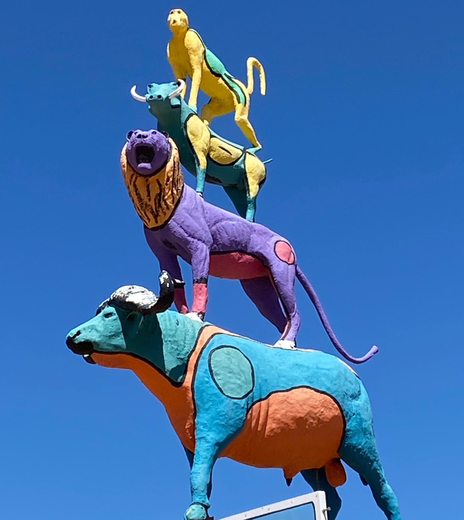 Der Flieger nach Kapstadt ging erst kurz vor 14 Uhr am nächsten Tag. Wir haben daher am Vormittag in aller Ruhe unsere Sachen gepackt, erste Weihnachts-Telefonate geführt und gewartet. Gegen 11 Uhr haben wir uns auf den Weg zum Flughafen gemacht. Wir sind an der Namibianischen Interpretation der Bremer Stadtmusikanten vorbeigefahren (Wasserbüffel, Löwe, Warzenschwein, Pavian).